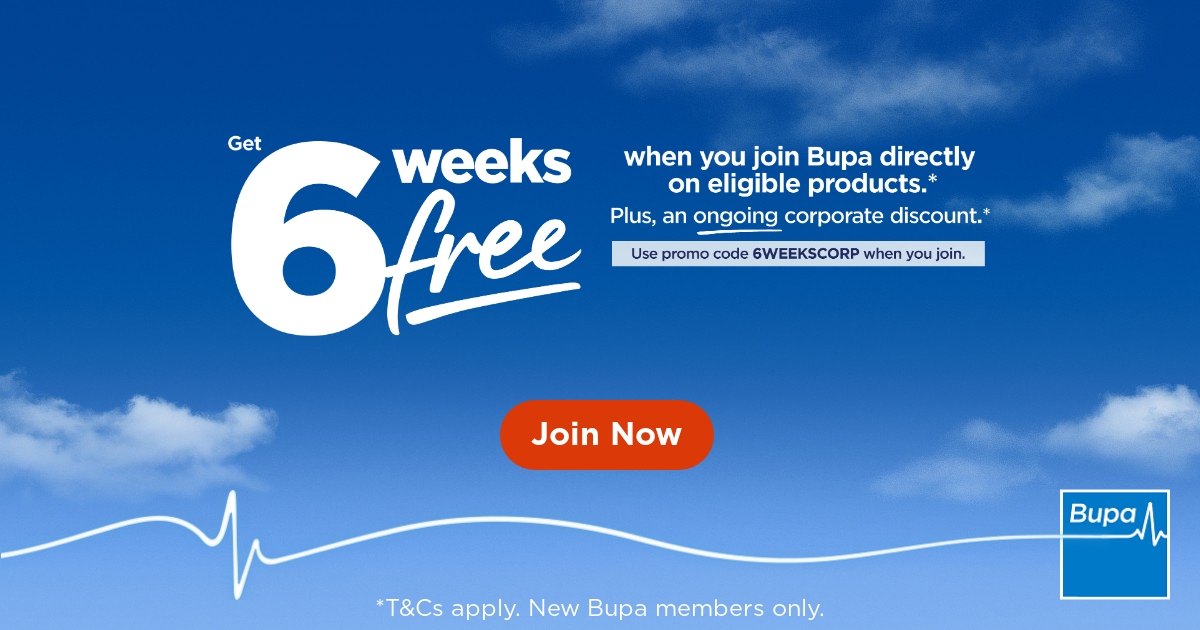 Bupa Corporate is currently offering 6 weeks free* for new Bupa members who join directly on eligible products, plus an ongoing corporate discount*.